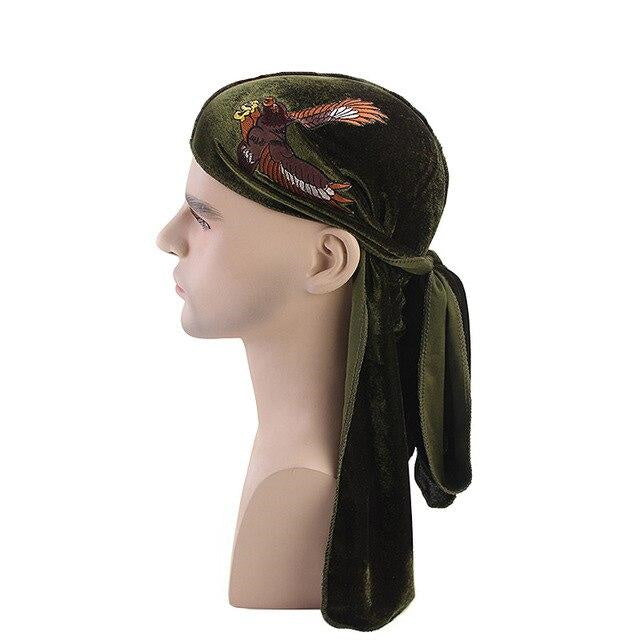 Ein wundervoller gestickter Adler wird Sie bei all Ihren Abenteuern führen, ein Durag für Männer mit grüner Farbe und aus einem angenehmen Samt nur für Ihr Haar.